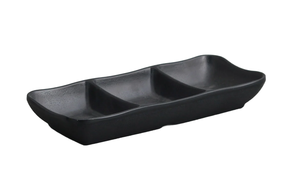 Meet The 3-Part 8X19 Zen Stone-Like Melamine Black Sauce Dish From Efay, An Elegant And Functional Serving Solution That Will Upgrade Any Table. This Designed Serving Utensil, Made Of High-Quality Black Melamine And With A Relaxing Zen Stone-Like Appearance, Will Present Your Dishes In Style And Give A Luxurious Look To Any Event. Thanks To The Melamine Material, This Sauce Dish Is Extremely Durable, Easy To Clean And Maintain. Its Division Into Three Separate Compartments Allows You To Conveniently Serve A Variety Of Dips, Sauces, Snacks Or Sushi. Choose Efay’S High-Quality Serving Utensil For Perfect Hosting, At Home Or In A Restaurant.